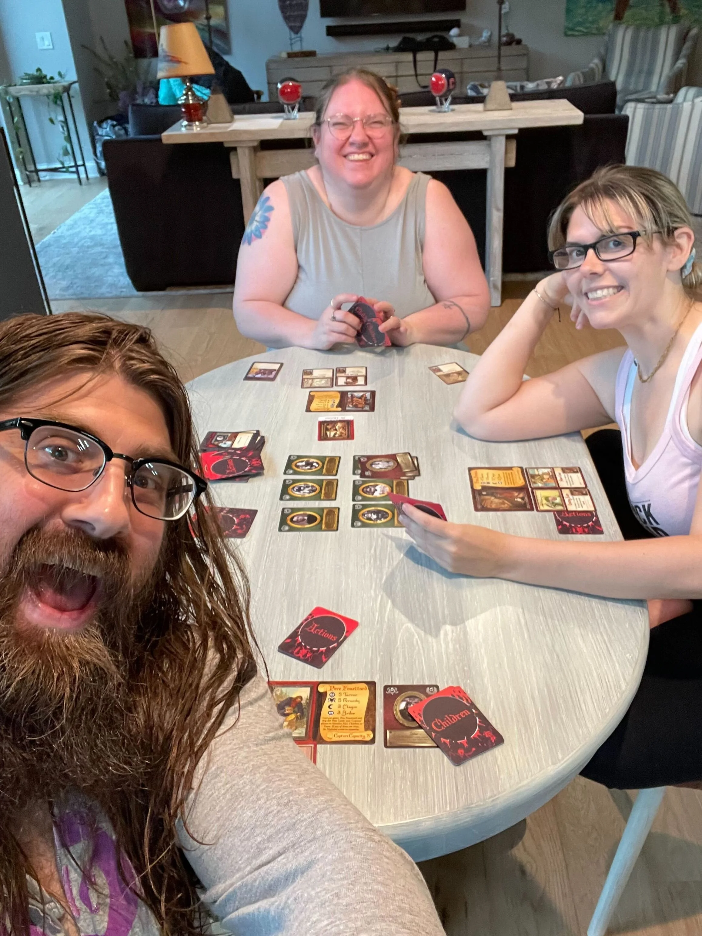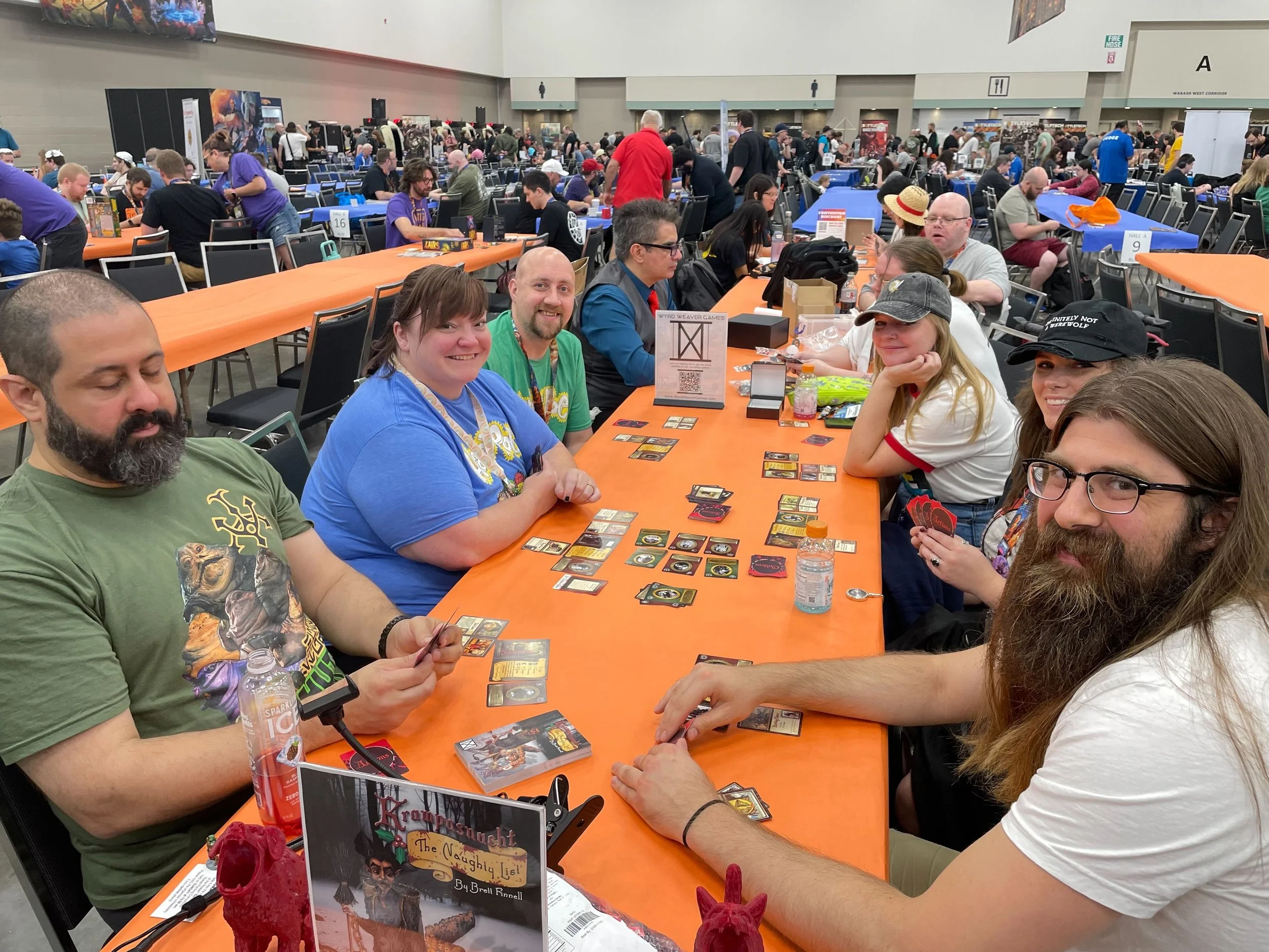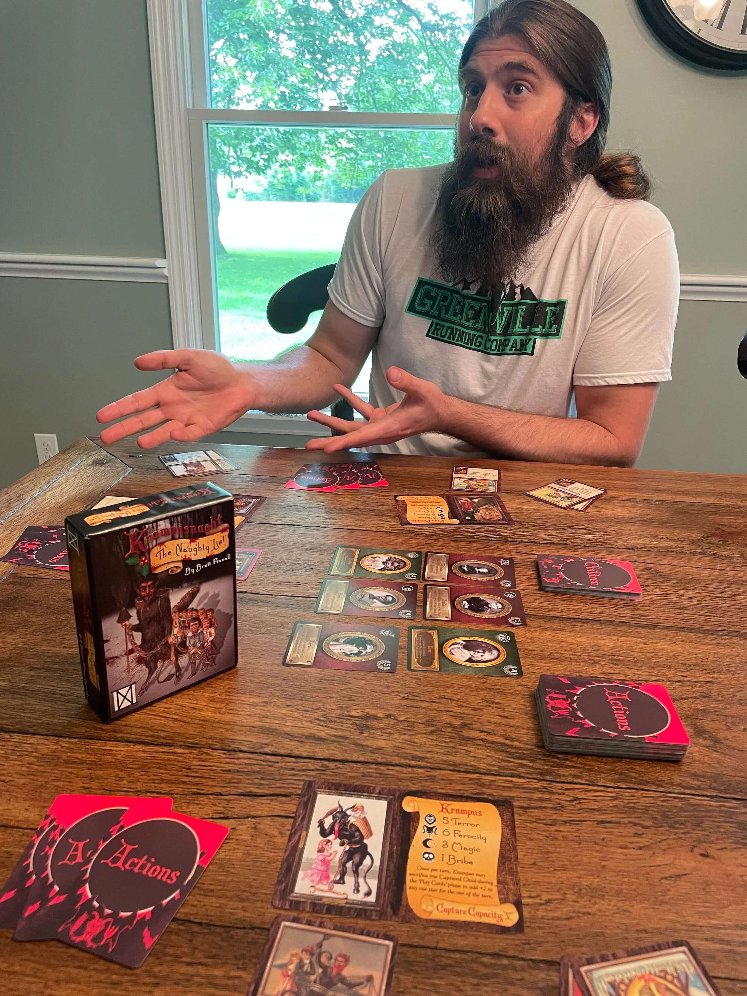 Designer Brett Finnell (left, in green) shows off Krampusnacht: The Naughty List at GenCon 2025