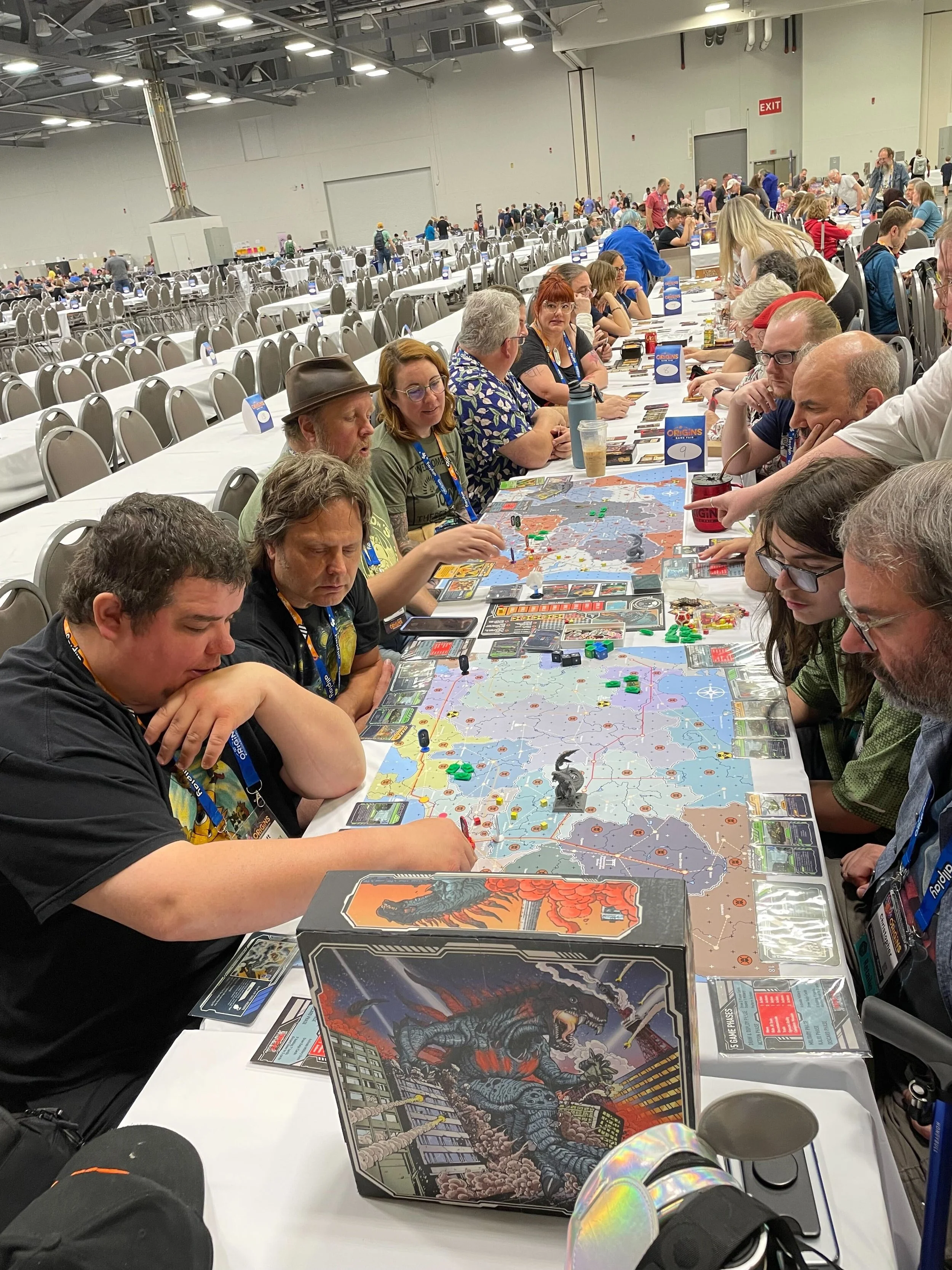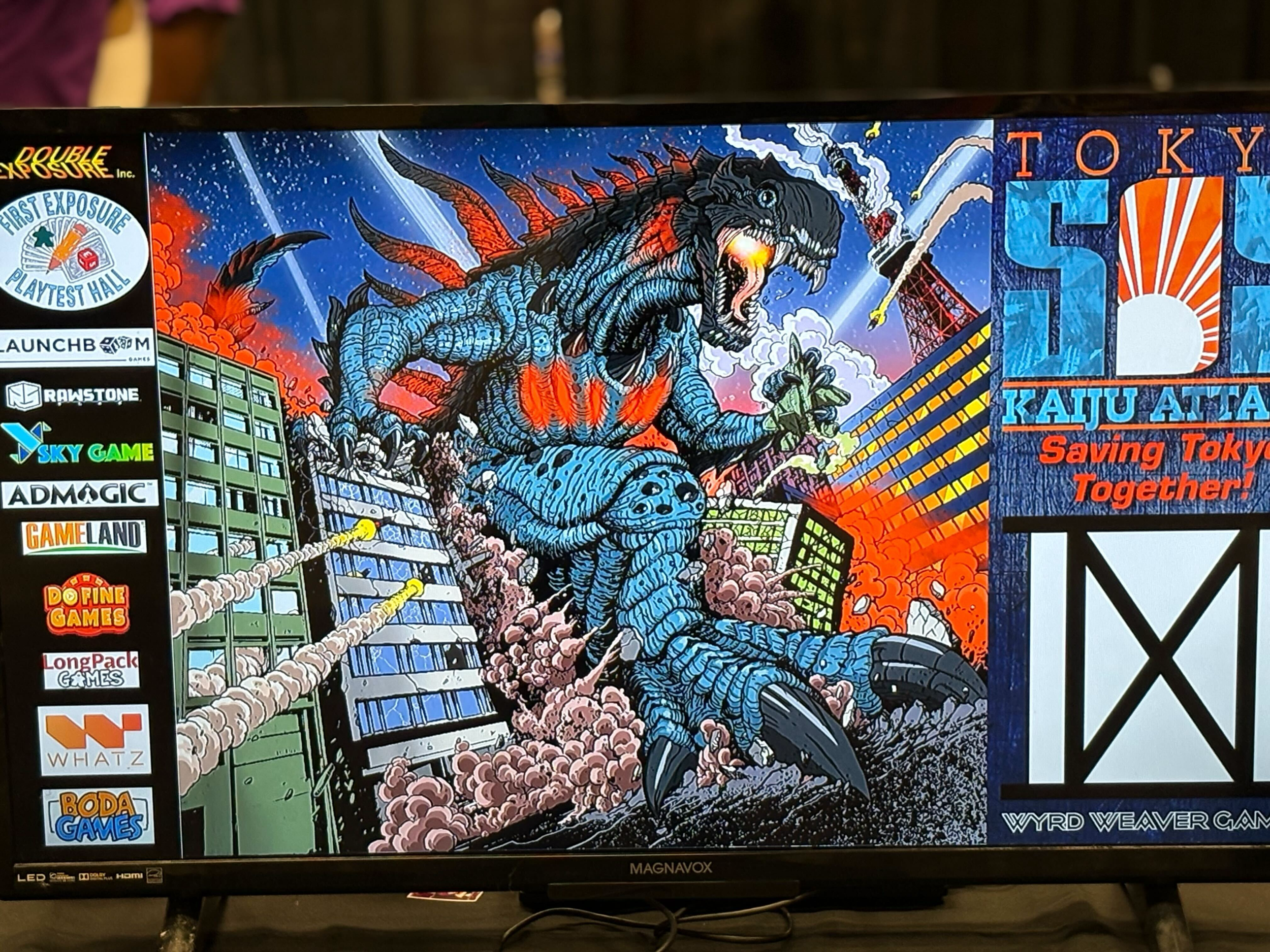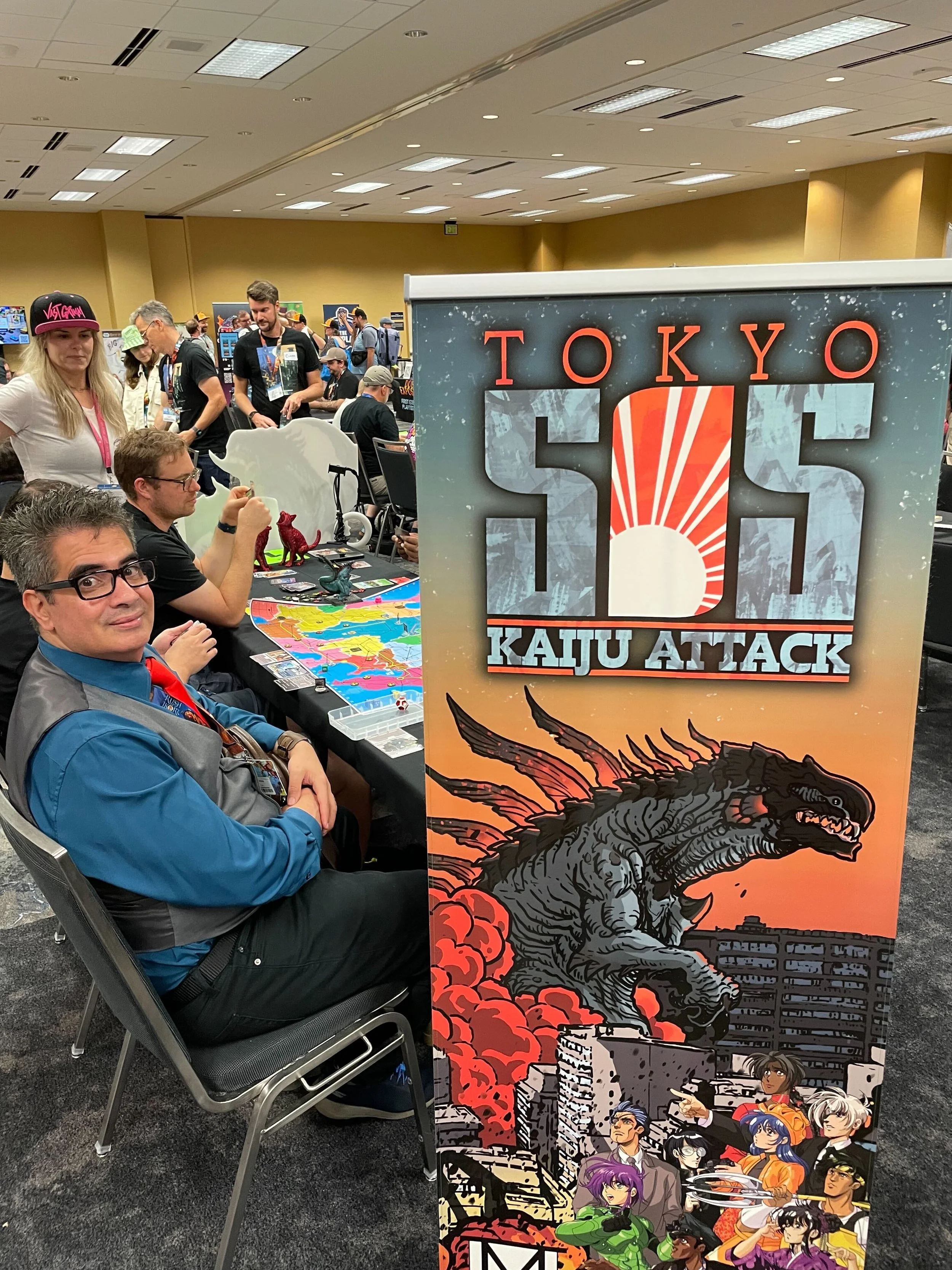 Mark Dos Santos, Tokyo S.O.S. Kaiju Attack! designer, waits for yet another full table at First Exposure, GenCon 2025